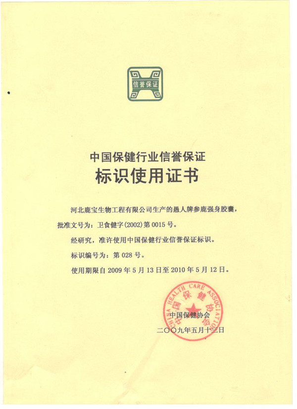 中國保健行業(yè)信譽保證標識使用證書
